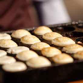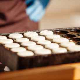 Сейчас оладушки выпекаются на современном электрогриле с маленькими ячейками специальной формы. Именно они и делают угощение таким пышным и удобным. Каждая оладушка поливается ягодным топпингом, взбитыми сливками, Nutella или сгущенкой.
